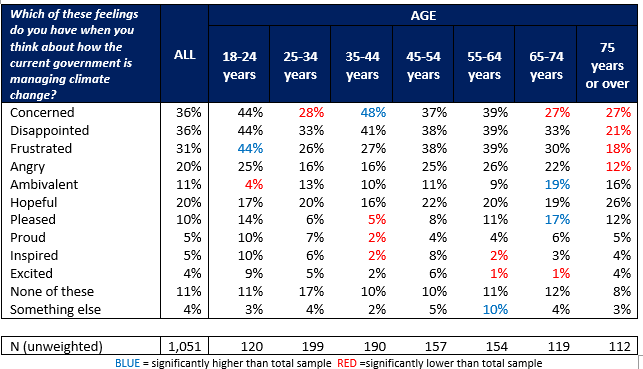Most expressed negative feelings about how the current Government is managing climate change, with ‘concerned’, ‘frustrated’, ‘disappointed’ and ‘angry’ the words most commonly chosen.