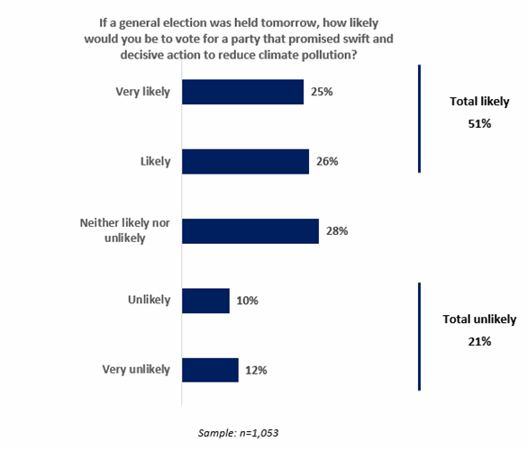 51% (1,964,000 adults) say, if a general election was held tomorrow, they would be likely to vote for a political party that promised swift and decisive action to reduce climate pollution.